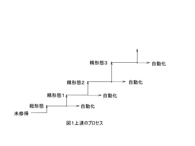 そこで、もし粗形態が定着した段階で、自動化に至る前に機械的反復ではなく、内省的反復を繰り返していけば、いつしか今度は精形態(第2段階)の発生にたどり着くようになる。それはあたかも最初のバケツが一杯になった後、さらに第2のバケツを用意して、それに水をそそぎ込んでいくことに例えられる。第2のバケツを用意することは、もっと上手くなりたいと思って内省的反復を繰り返したり、指導者に教わったりして、より上のレベルを目指すことに他ならない。そのような努力により、学習者はまたある日突然、第2段階の精形態の発生に至り、さらに定着へと進んでいくことになる。そして、さらに上を目指すことにより、すなわち第3のバケツを用意することにより、今度は第3段階の精形態に進んでいく。このようにして、より上のレベルを目指して内省的反復を繰り返していく限り、当然年数はかかるかもしれないが、1段ずつ上位のレベルへと上昇していくことになる。