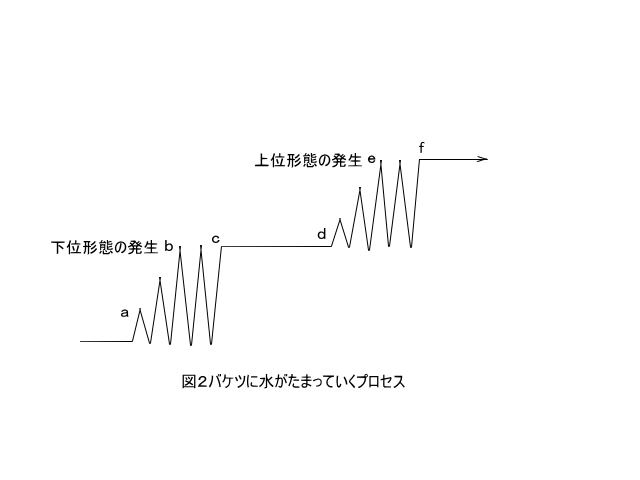 上の図2ではbーd間が下位レベルの形態の発生から定着に至るプロセスを、d-e(aーb)間がバケツに水をためている途中のプロセスを表し、e(b)に至ってようやく新しい上位レベルの形態が発生し,f(c)に至って定着に達したことを表している。以下、このプロセスをピアジェの発達理論で説明してみたい。