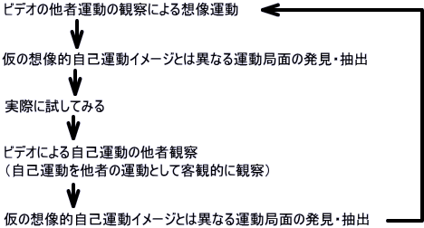 このように、イメージトレーニングは実際の身体を動かすトレーニングと相補的に利用して初めてその効果が上がることになる。そのようなトレーニング方法は以下のようなループ状の図式になる。